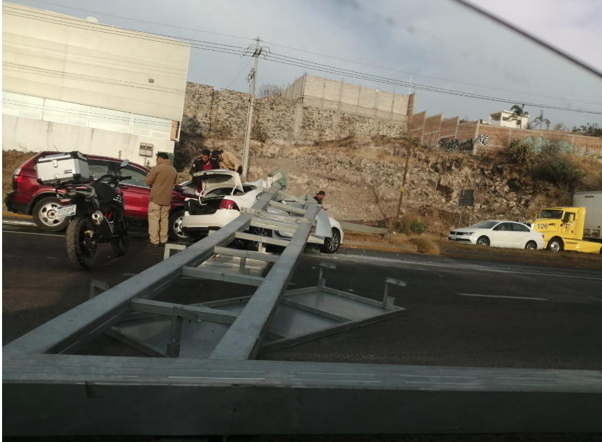 En el accidente se vieron involucrados un auto blanco, una camioneta color vino y un trailer. De acuerdo con testigos, “un cerrón” ocasionado por el chofer del trailer al realizar una maniobra provocó el incidente y la caída de señalamientos sobre uno de los vehículos. Al momento hay una mujer gravemente herida y el cierre total de esta vía.